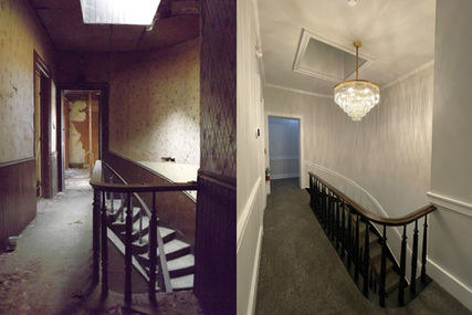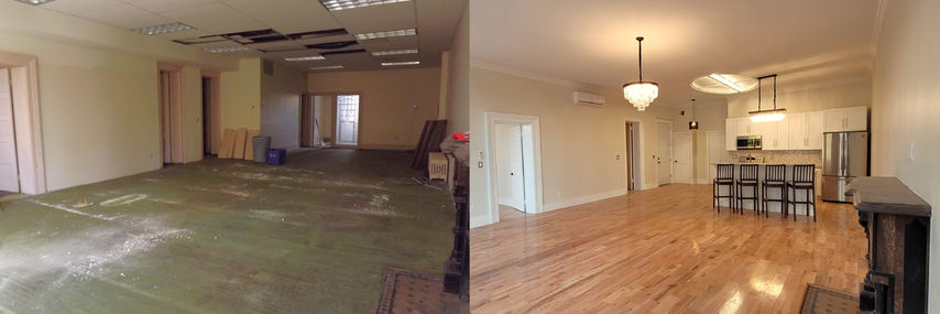 Additionally, these incredibly historic buildings have housed a window store, rug store, hat store, grocery store, piano store, small electrical appliance store, florist, furniture store, rug cleaner, sign maker, women's clothing store, auto-shop, slot-car racing, photo galleries, art studios, restaurants, offices of lawyers, brokers, doctors, insurers and architects, as well as meeting places for the Board of Education, Knights of Pythias, The Elmira Camera Club, and The Elmira Firemen's Association. When we purchased the property in 2019, much of the building was in moderate to severe disrepair. Different sections of the building had different degrees of decay, with sections of the first floor having been vacant for a relatively short time, and sections of the third floor abandoned for several decades, where the most damage was found. The slideshow below shows the building's beautiful renovated spaces in 2023, compared with photographs from the condition we found the building in when we purchased in 2019.