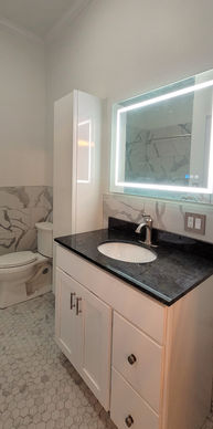 The brand-new designer kitchen boasts tall white cabinetry, granite counter tops, stainless steel appliances including French-door refrigerator, glass top electric range, over-the-counter microwave, dishwasher, as well as a spacious breakfast bar. The bathroom features an oversized soaking tub, tile floors and walls, custom vanity with granite counter, Kohler toilet, and brushed satin nickel bathroom fixtures.